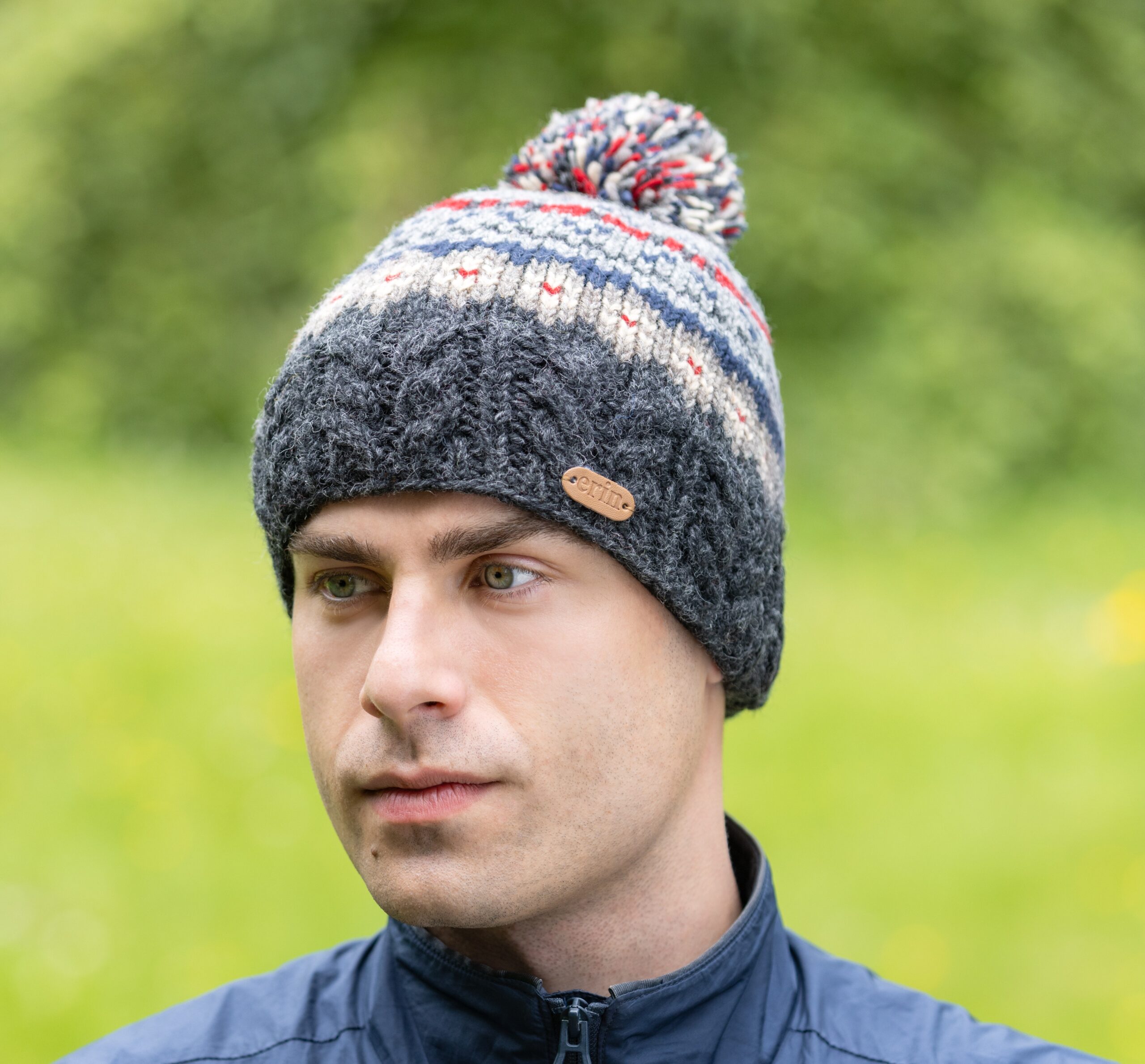 HomeShopMenAran Cable Bobble Wool Hats PK2004 Aran Cable Bobble Pullon Hat Charcoal/Red